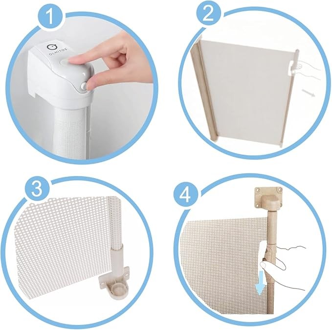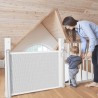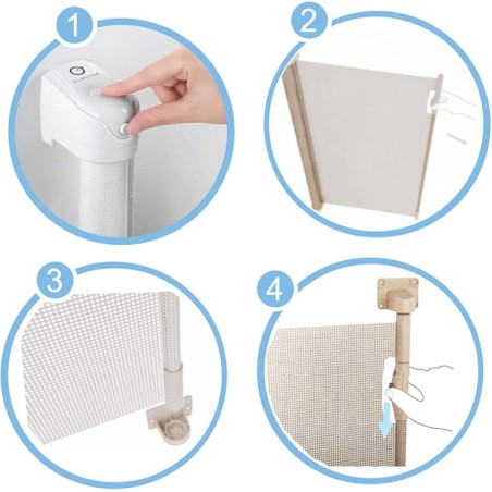 • Puerta de seguridad retráctil que evita caídas y accidentes en el hogar. Fabricada con una malla resistente, se instala en puertas o huecos de hasta 140 cm de ancho. Su diseño permite usarla con una sola mano y reduce el impacto visual cuando está enrollada