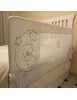 Barrera para nido o compactas, también para canapé o cama normal. Longitud de 1.80cm y 65cm de altura. La barrera más alta del mercado. Abatible y plegable. Desmontable y lavable. Color blanco con osito gris.