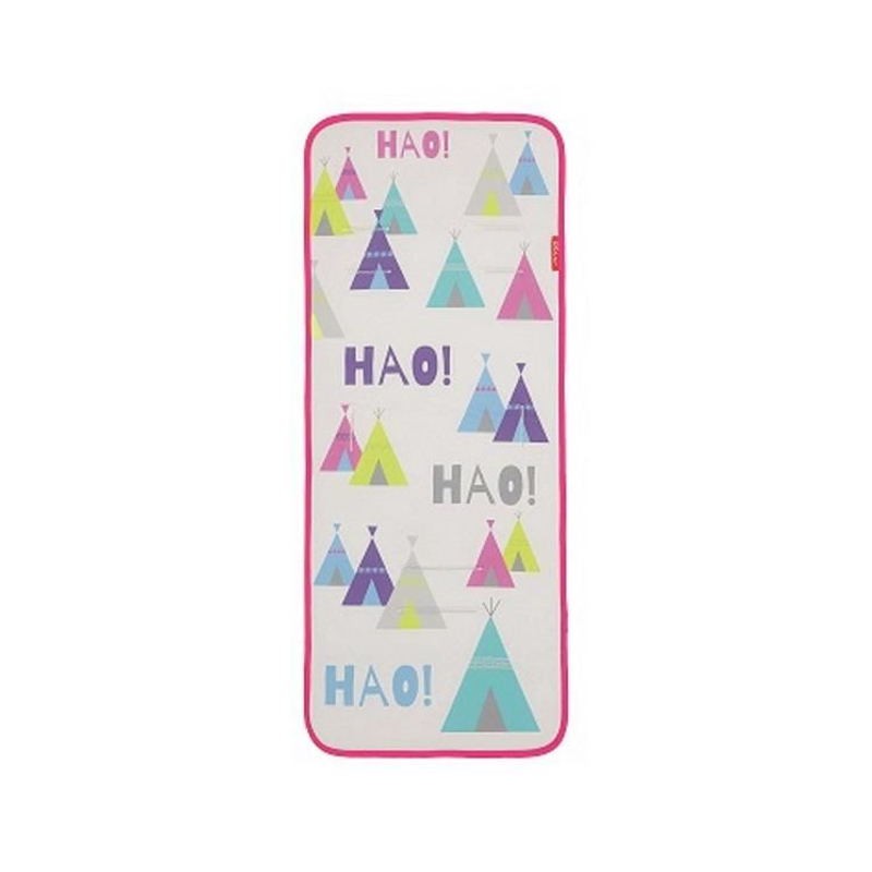 Colchoneta para silla ligera transpirable con cintas para ajustarla a la silla. Estampado Tipis de colores sobre fondo gris.