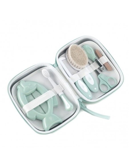 Práctico set de higiene compuesto de termómetro de baño, cepillo dental para bebé, cepillo y peine de pelo, tijera, cortauña, limas.