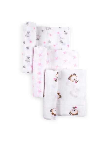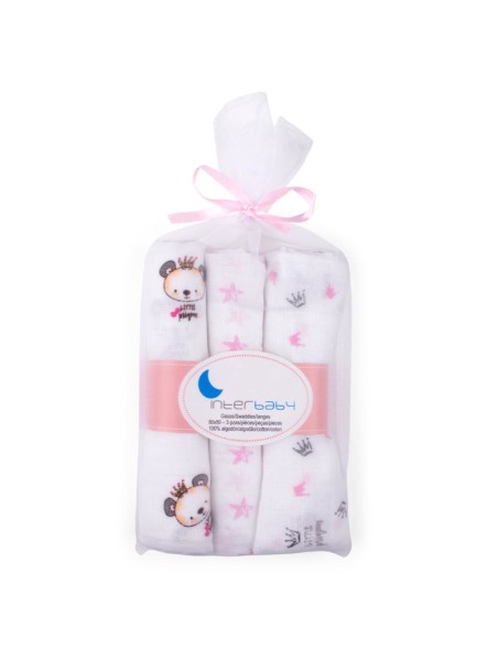 Pack de 3 gasas de algodón estampadas rosa de Interbaby. Un regalo muy práctico para los primeros cuidados de los recién nacidos.