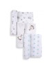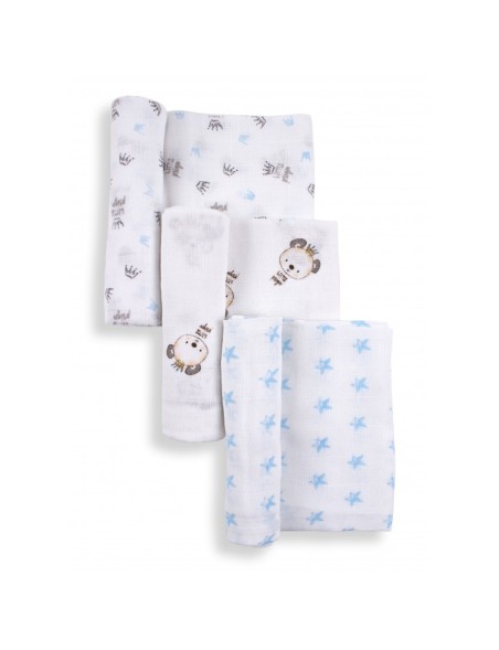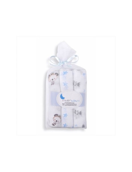 Pack de 3 gasas de algodón estampadas azul de Interbaby. Un regalo muy práctico para los primeros cuidados de los recién nacidos.