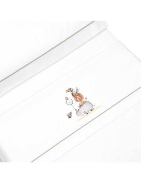 El diseño Rino León combina un fondo blanco impoluto con detalles en un refrescante verde agua y un simpático bordado/estampado de león y rinoceronte, ideal para crear un ambiente sereno en la habitación: