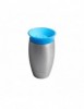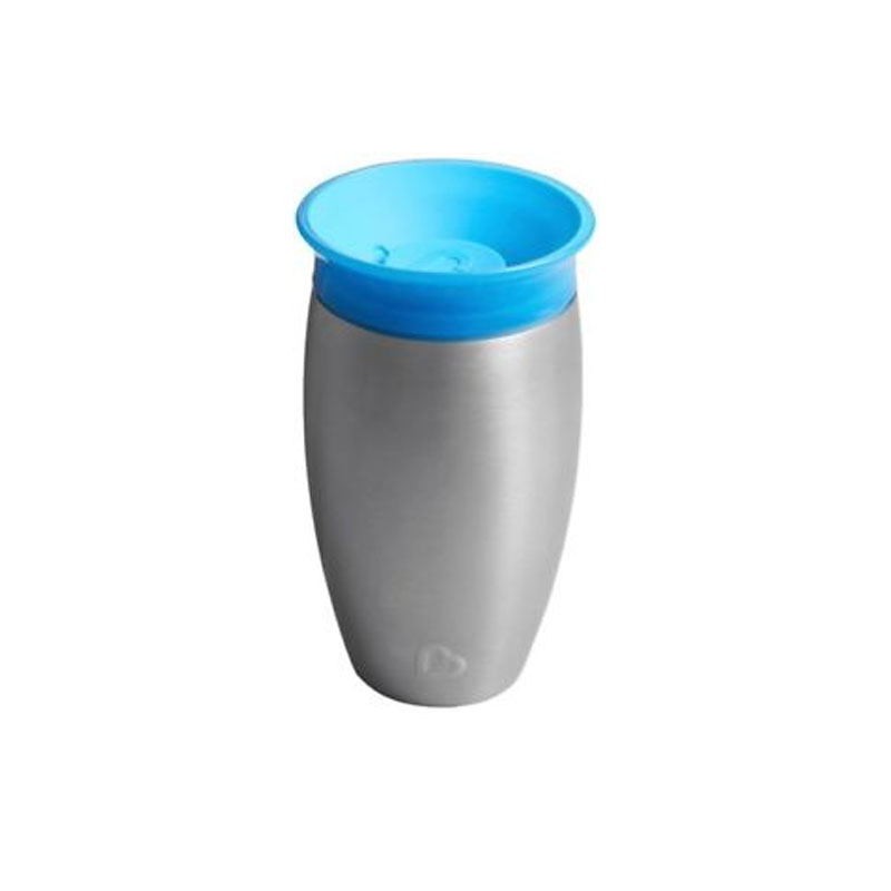 Vaso con doble pared de acero inoxidable que mantiene el frío hasta unas 10 horas. El niño o niña podrá beber por cualquier borde del vaso sin que se derrame. Incluye tapa a presión. Libre de BPA. Capacidad de 295 ml. Color azul.