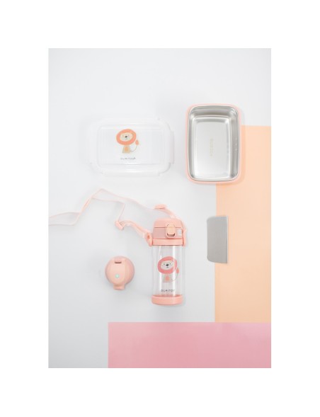 Está compuesto por una botella tritán con 2 tapas (una con pajita y una con bocal) y una fiambrera.