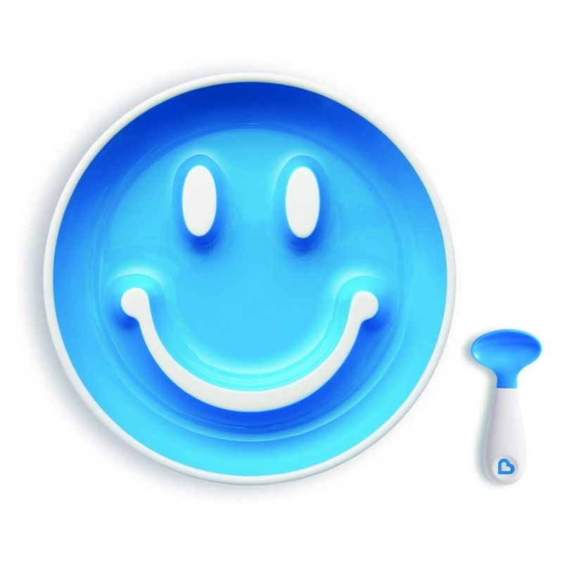 Plato antideslizante con forma de cara sonriente y cuchara Scooper que ayuda al bebé a autoalimentarse.