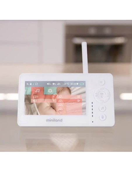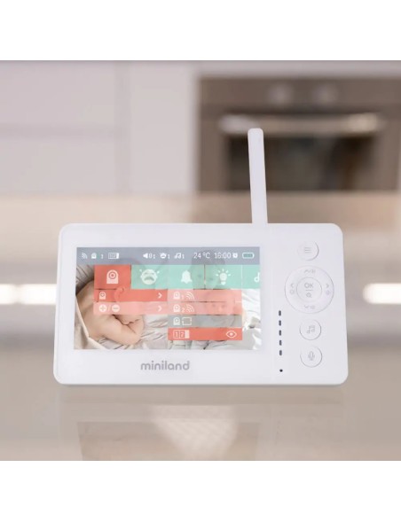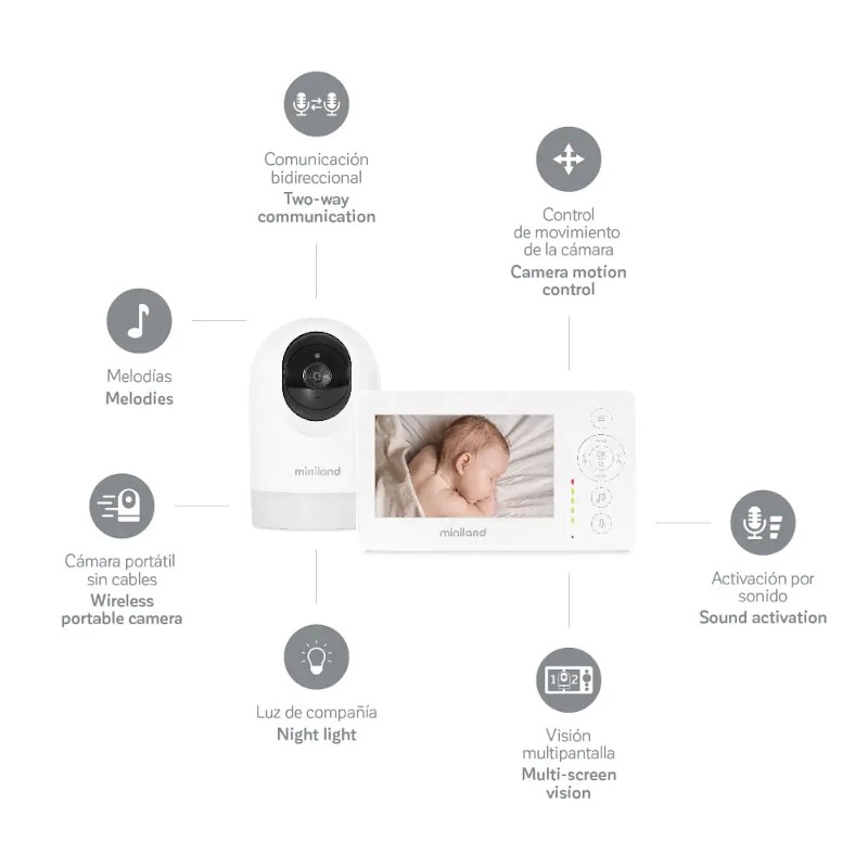 A través de su gran pantalla panorámica de 4.3 pulgadas podrás ver, escuchar e interactuar con tu bebé a través de su sistema two-way. La cámara también permite ser teledirigida a través de la pantalla, permitiendo ampliar la imagen, rotar la cámara o dirigir la lente arriba y abajo. El digimonitor 4.3" Pro permite añadir opcionalmente una segunda cámara para extender la visión a distintos espacios o ángulos. Además, incorpora aviso de tomas, 5 melodías de sueño y activación por voz ajustable.